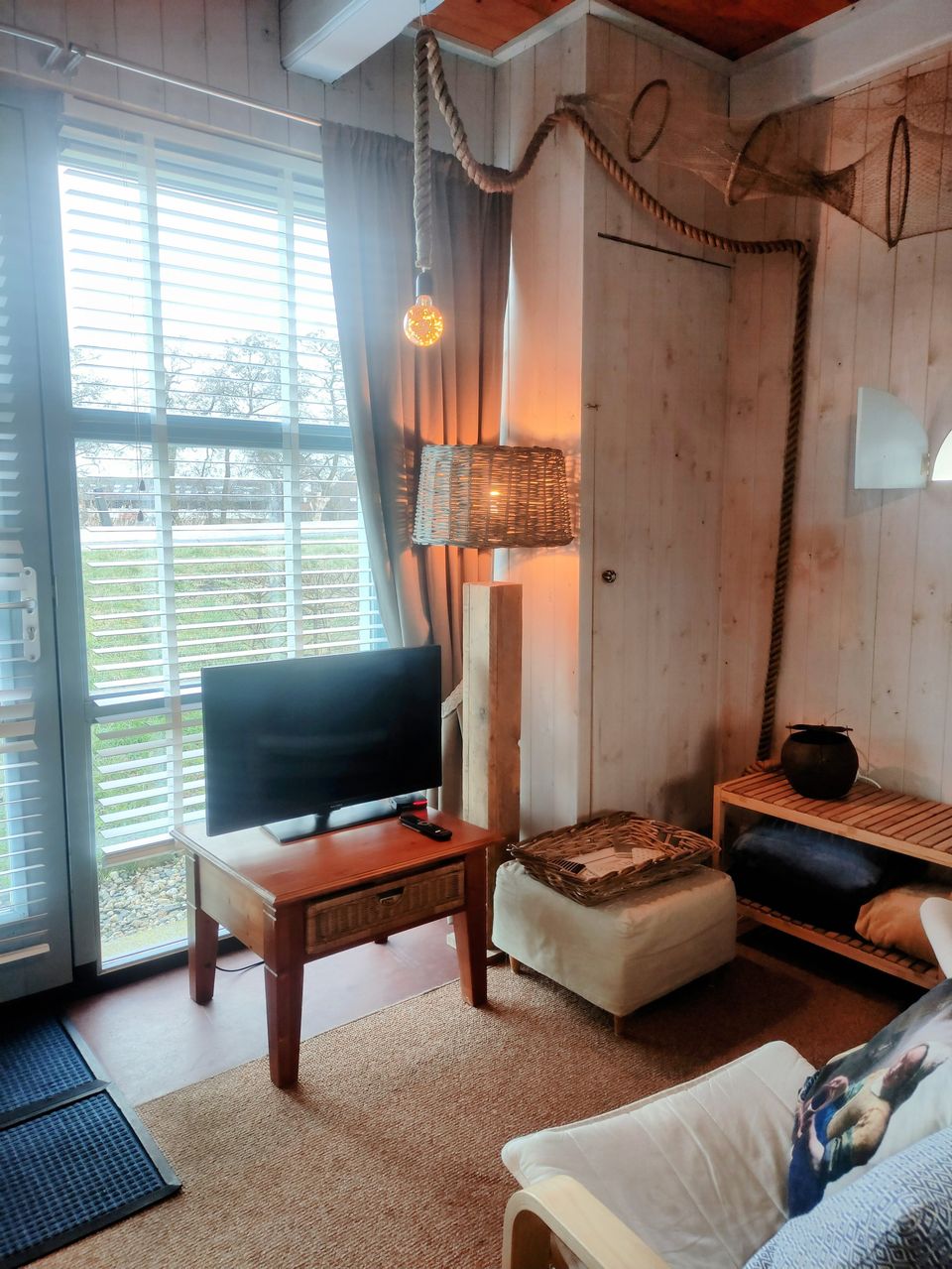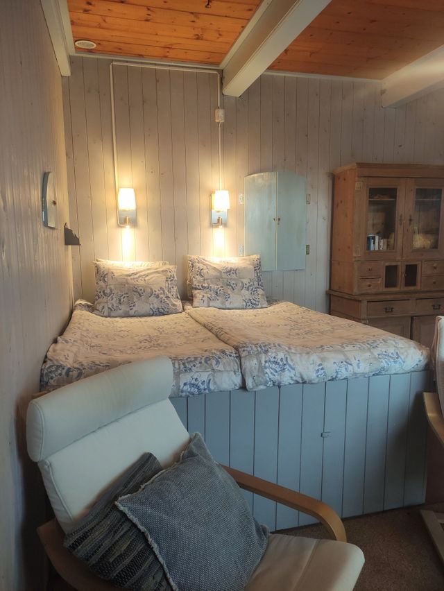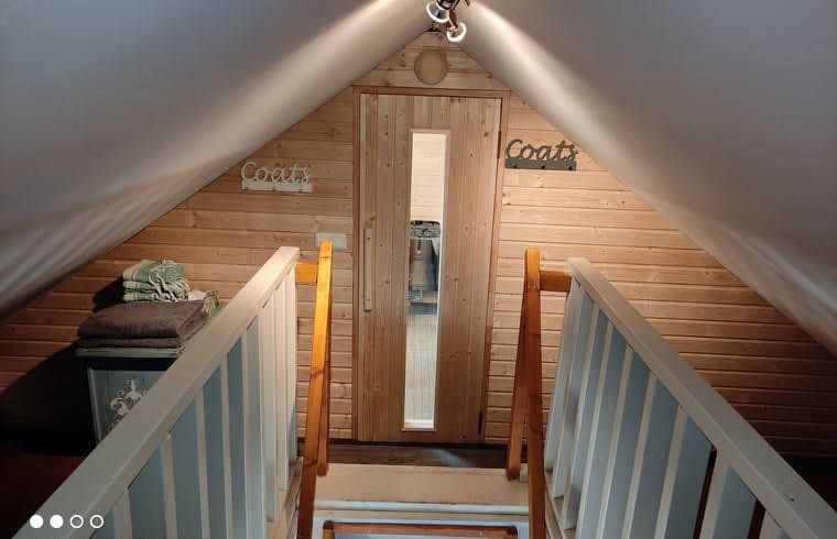 Wohnzimmer mit Fernseher, Bett und voll ausgestatteter Küche. Badezimmer mit Badewanne und separater Dusche. Im Obergeschoss befinden sich eine Sauna zur kostenlosen Nutzung und ein Ruhebereich. Draußen gibt es eine Terrasse mit Gartenhäuschen, Grill und Feuerstelle.