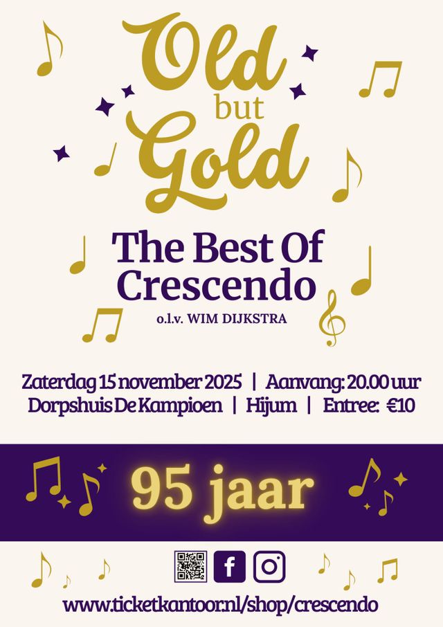 Op zaterdagavond 15 november is er goud dat klinkt in Dorpshuis de Kampioen te Hijum. Fanfare Crescendo, onder leiding van Wim Dijkstra, viert namelijk haar 95-jarig bestaan met een verrassend concert; ‘OLD BUT GOLD, The Best of Crescendo’.