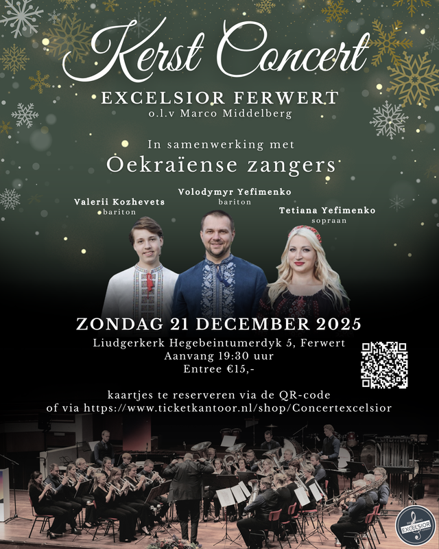 Brassband Excelsior Ferwert brengt een unieke mix van kerst-, klassieke en moderne muziek samen met drie getalenteerde Oekraïense zangers! De voorverkoop is inmiddels gestart. Tickets zijn te verkrijgen via de link "Bekijk de website". Vol = vol!