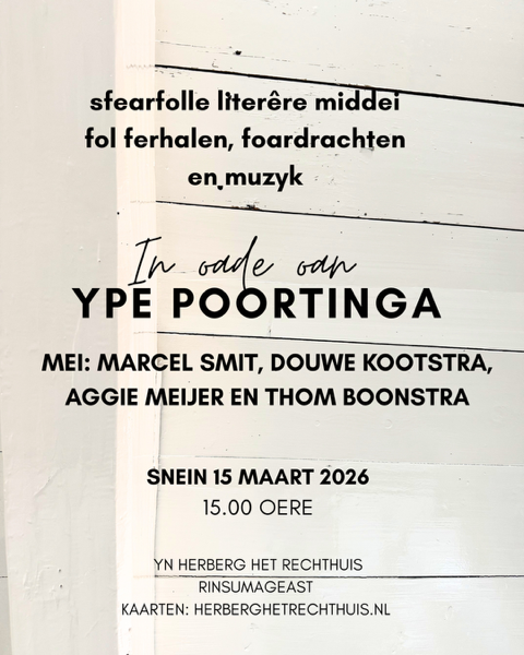Op zondag 15 maart 2026 vindt in het hart van Rinsumageast, in Herberg Het Rechthuis, een middag plaats die volledig is gewijd is aan het werk van de Friese schrijver Ype Poortinga (1910-1985) uit Rinsumageast.