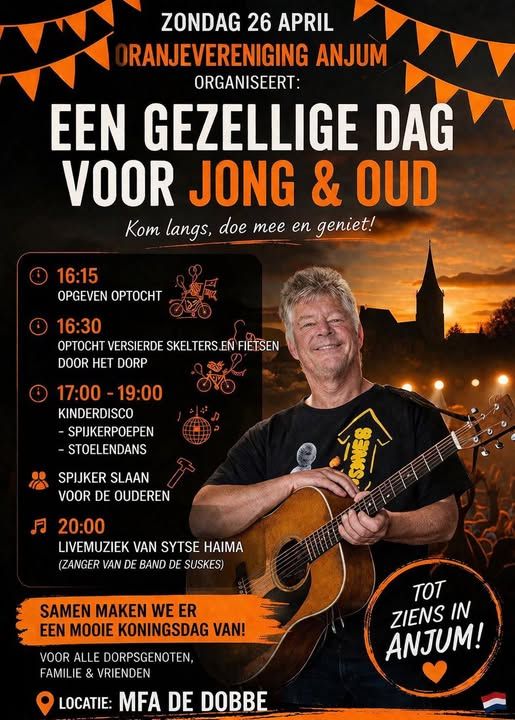 Kom op zondag 26 april naar Anjum en vier Koningsnacht met livemuziek van Sytze Haaima. Een avond vol muziek, sfeer en gezelligheid.
