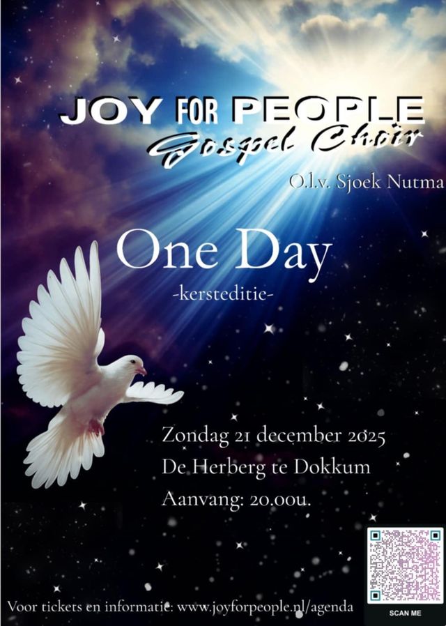 Kerstconcert 'One Day' door Joy for People Gospel Choir🌟 Joy for People is de laatste tijd wat compacter geworden en de vraag vanuit kerken veranderde mee. Daarom heeft het koor het bestaande programma speciaal voor kerst in een nieuw, sfeervol jasje gestoken. ✨